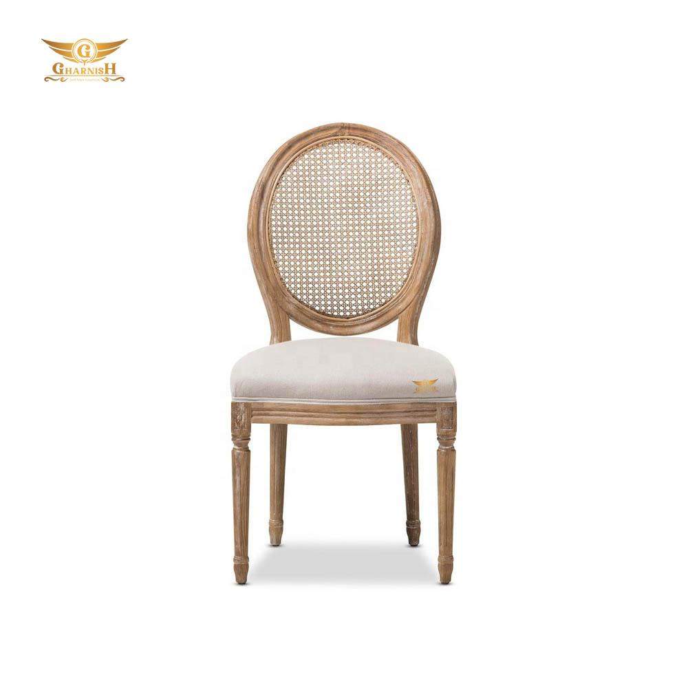 Antique French style teakwood-made wicker chair with art leather fabric. Solid oval round back with wicker/rattan design dining Chair by Gharnish - Premium quality dining chair makers in Hyderabad, India.