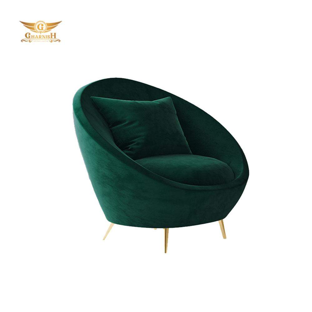 This Half moon accent chair is very professionally upholstered by our expert manufacturers in Hyderabad and customized to your needs. It has green velvet fabric with an edge on the bottom in golden SS legs.