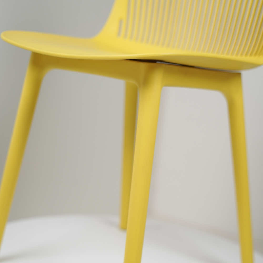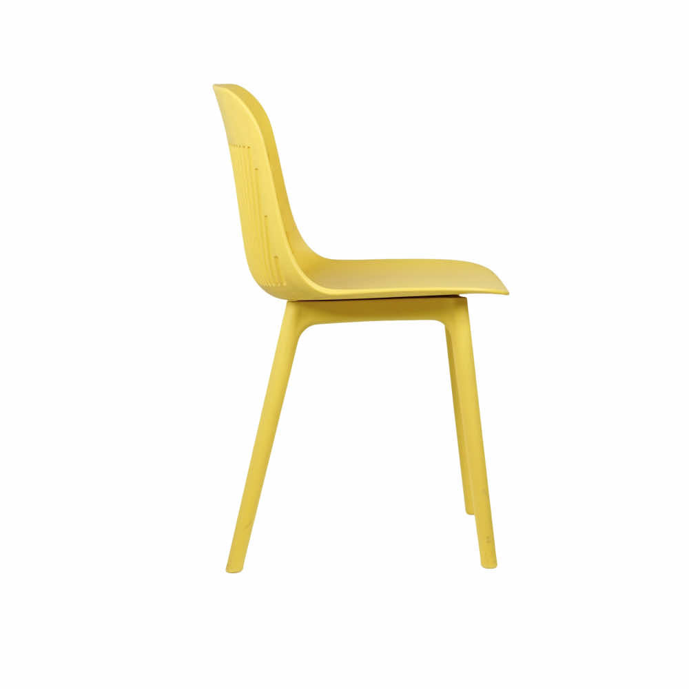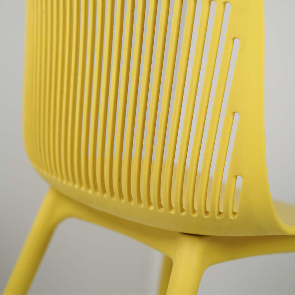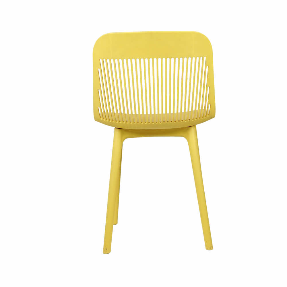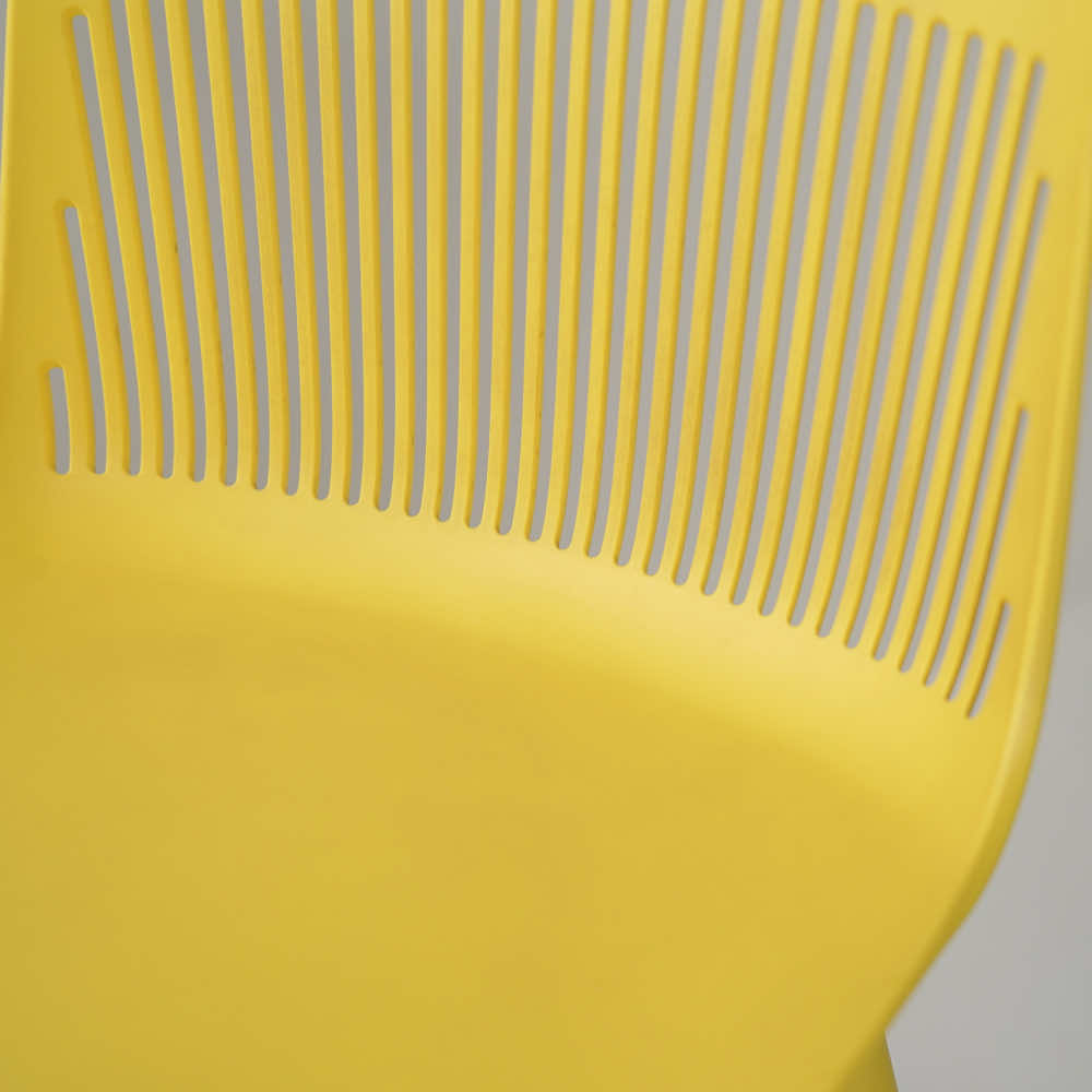 Its bright sunny-yellow tone adds instant energy to any environment, making it ideal for cafés, quick-bites, bistros, and casual dining restaurants that want to create an inviting and cheerful atmosphere. The ergonomic backrest, crafted with ventilated slat detailing, ensures long seating comfort while maintaining airflow — a practical choice for India’s tropical climate.